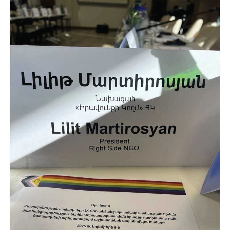 Միջոցառման ընթացքում որպես խոսնակ հանդես է եկել «Իրավունքի Կողմ» իրավապաշտպան հասարակական կազմակերպության նախագահ Լիլիթ Մարտիրոսյանը։ Իր ելույթում նա ներկայացրեց կազմակերպության գործունեությունը և 2024 թվականի հունվարից և 2025 թվականի հոկտեմբեր ամիսների ընթացքում արձանագրված ՍԿԳԻ-ի հիմքով ատելության հանցագործությունների դեպքերի ու իրավական գործերի ամփոփ պատկերը, ընդգծելով դրանց ազդեցությունը տրանս և ԼԳԲԻՔ համայնքի վրա։ Նա ներկայացրեց կազմակերպության կողմից տրամադրվող ծառայությունները, իրավական աջակցության հիմնական ուղղությունները, իրավական պաշտպանական մեխանիզմների արդյունավետության հարցերը, ինչպես նաև իրավապահ մարմինների արձագանքի դրական միտումները և առկա բացերը։